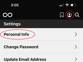 Tap the profile pic in the upper right-hand corner of the screen — the one that looks like a person in a circle — to open up the Settings menu. Then tap “Personal Info” to change your email or mailing address.